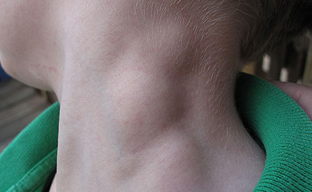 1) До 70% випадків захворювання починається з ураження шийних вузлів. Процес розвивається переважно з правого боку. Уражені лімфовузли збільшуються в розмірах (від горошини, до розміру великого яблука). Легко можна помітити деформацію шиї.