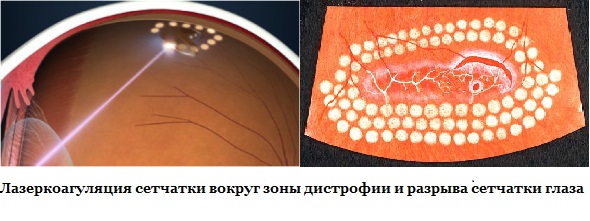 При цьому методі лікування лікар впливає лазером на дистрофічно змінені ділянки, розриви, відшарування сітківки. В результаті формуються рубці, які прикріплюють краю розриву або відшарувалася сітківки до хориоидее. Подібні зміни в результаті перешкоджають проникненню, а також концентрування рідини під сітківкою. Освіта міцної спайки відбувається приблизно за два тижні. Відсутність прогресування відшарування сітківки, її простягання за межі коагульованої тканини свідчать про успішність лазерокоагуляции.